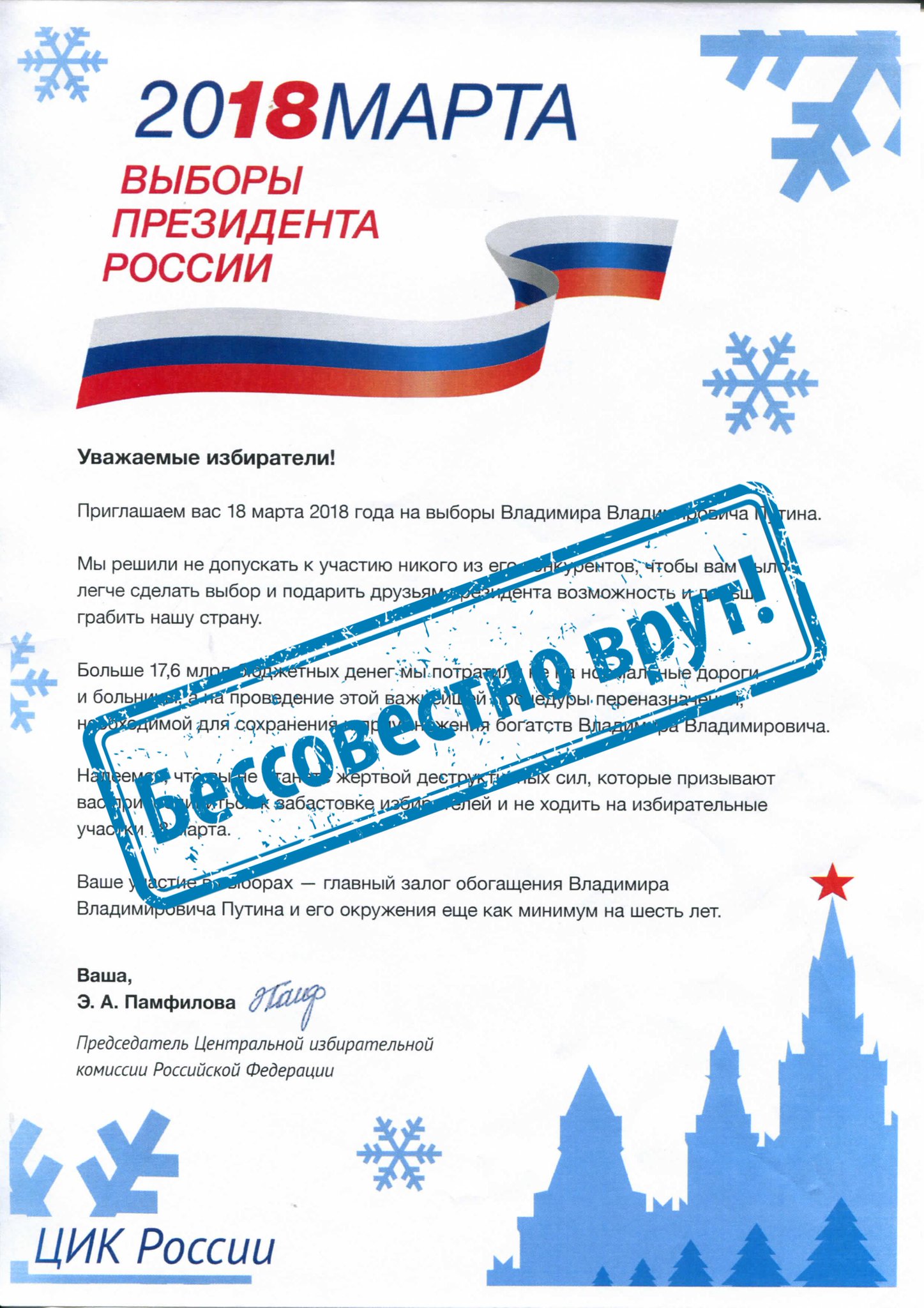 «В подъездах, местах массового скопления людей и через интернет распространяются поддельные приглашения на выборы от имени Председателя ЦИК России Эллы Памфиловой. ЦИК России не имеет никакого отношения к этим материалам», — сообщает ЦИК.