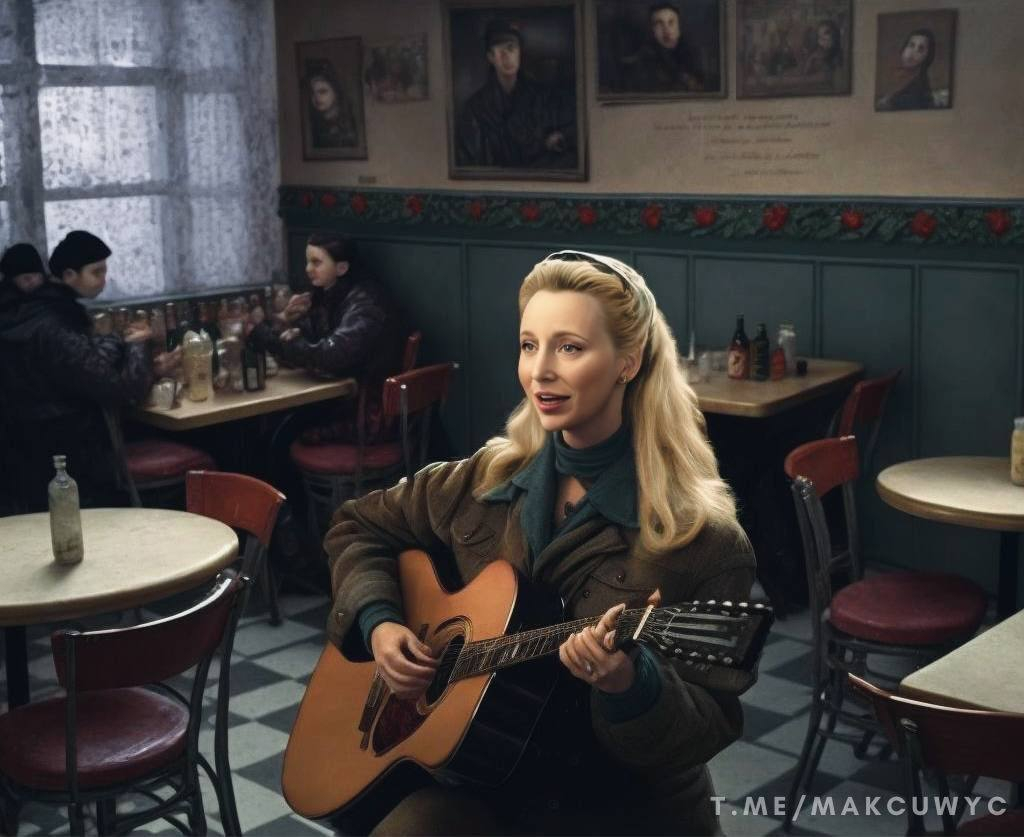 Романтичная натура, мечтающая сделать этот мир и людей в нем лучше. Midjourney увидела в ней советскую девчонку с гитарой в руках.