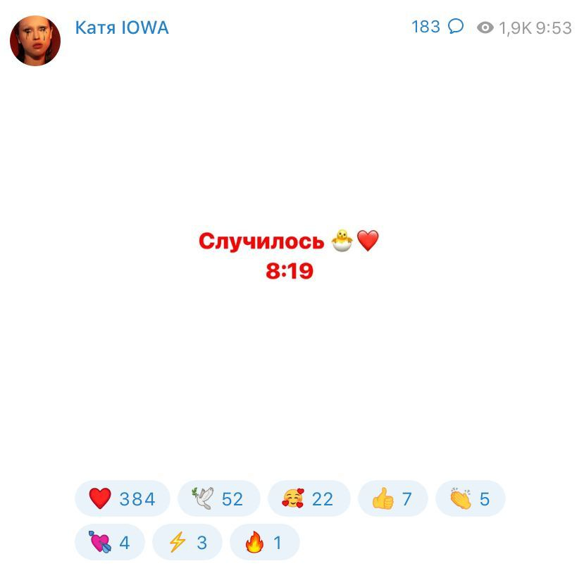Солистка группы IOWA Екатерина Иванчикова родила первенца. Радостной новостью она поделилась с подписчиками в своих социальных сетях.