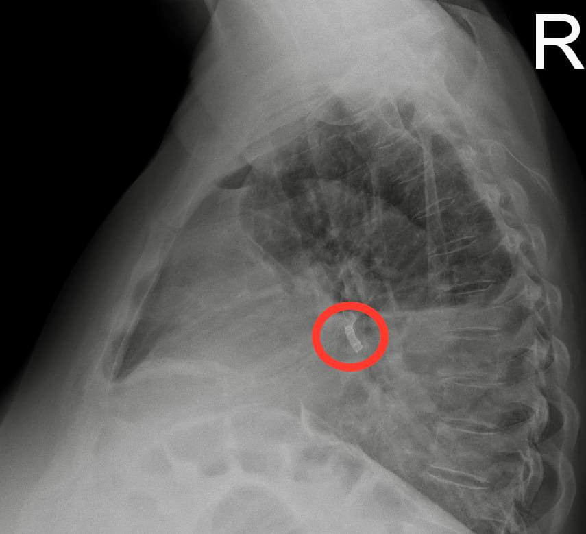 В ходе диагностики в НИИ имени Джанелидзе выяснилось, что в промежуточном бронхе справа находится инородное тело – его было видно на рентгеновском снимке и на КТ. Оказалось, что около года назад женщина во сне вдохнула часть зубного протеза. Не найдя эту часть, она решила, что где-то её потеряла.