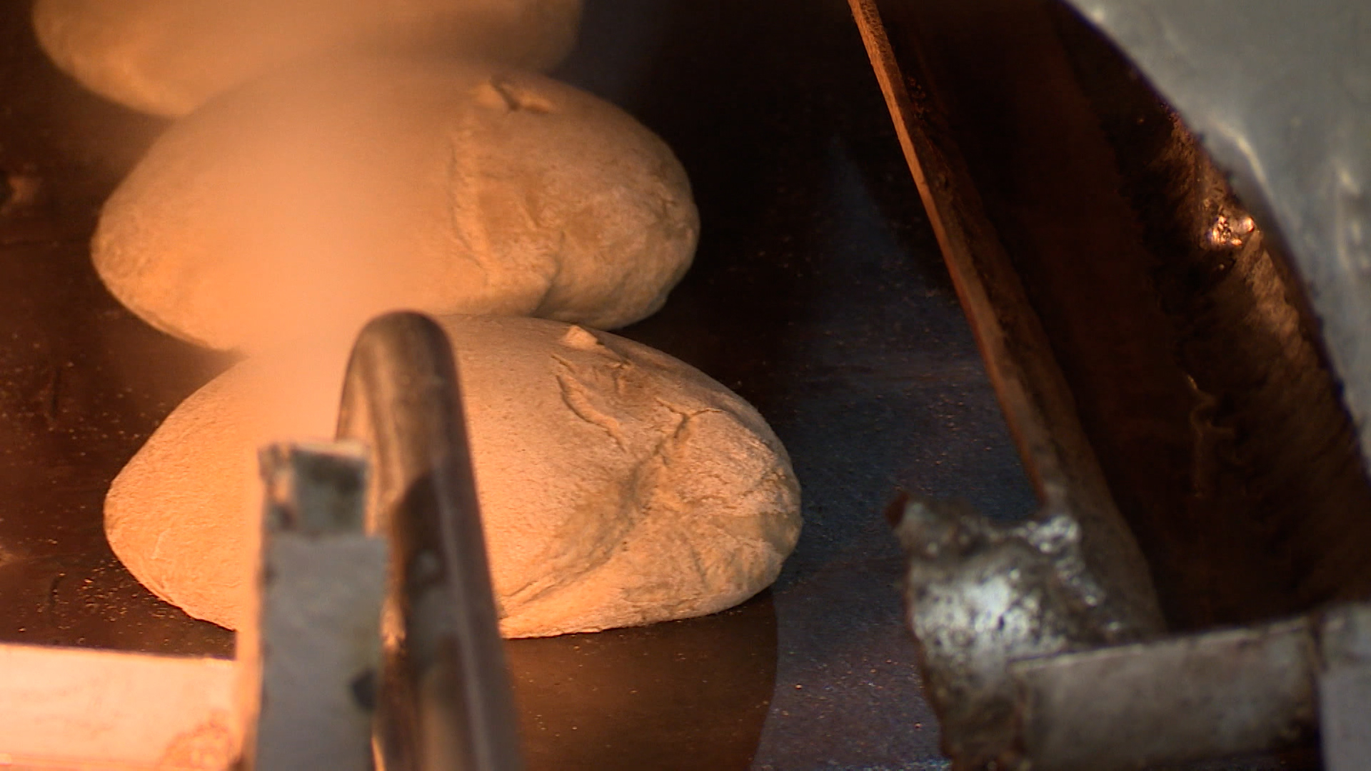 Спускаясь на этаж ниже, будущие караваи по спирали попадают в круговую печь. В самом начале жаркого пути хлеб обдают раскаленным паром.