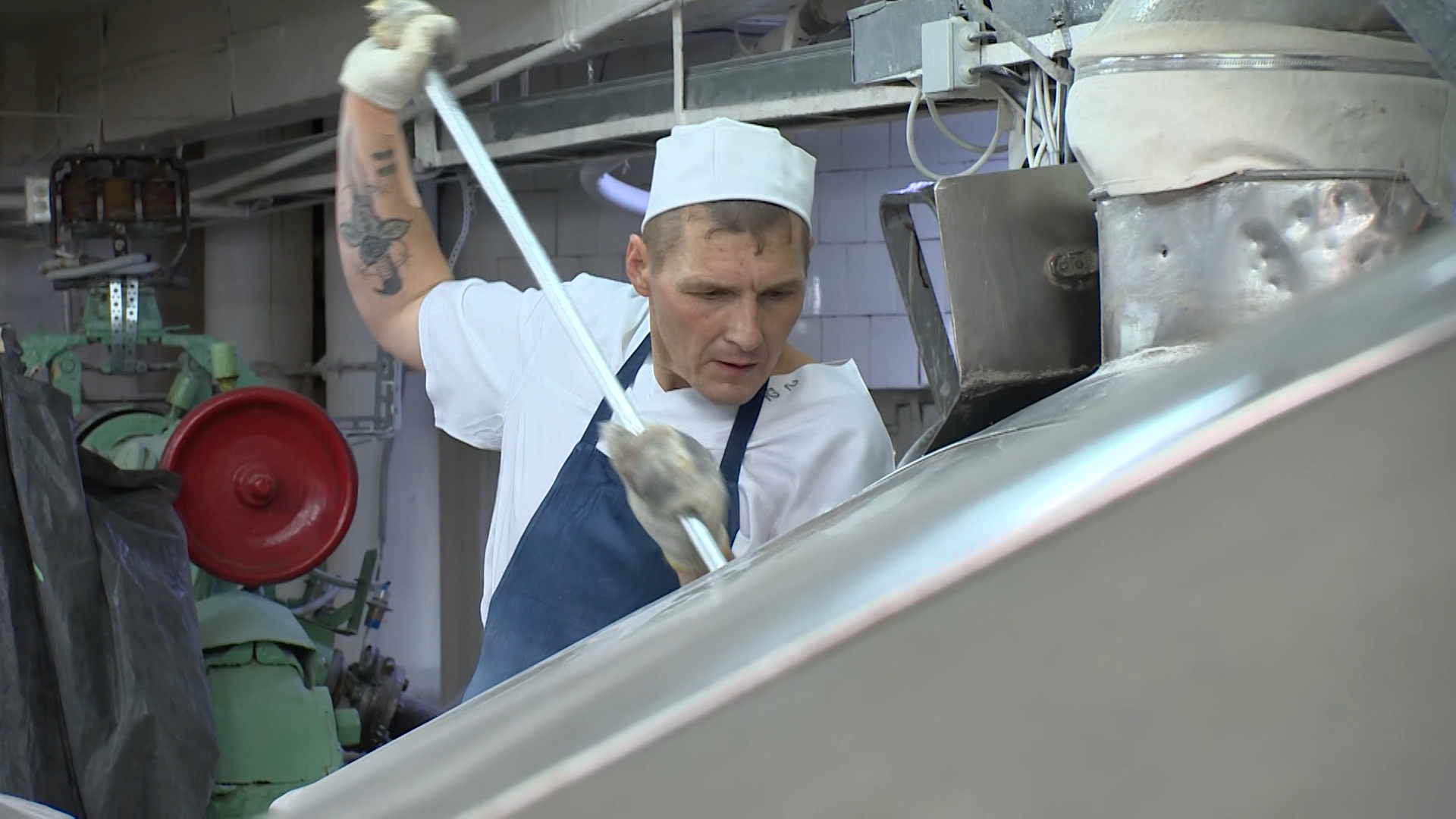 «Сейчас идет как раз слив дозировок — вода и соль, все — чистый продукт, ничего больше нет, сюда подходит, ссыпается мука, месится, здесь еще раз месится», – рассказала тестовод Анжелика Карапетян.