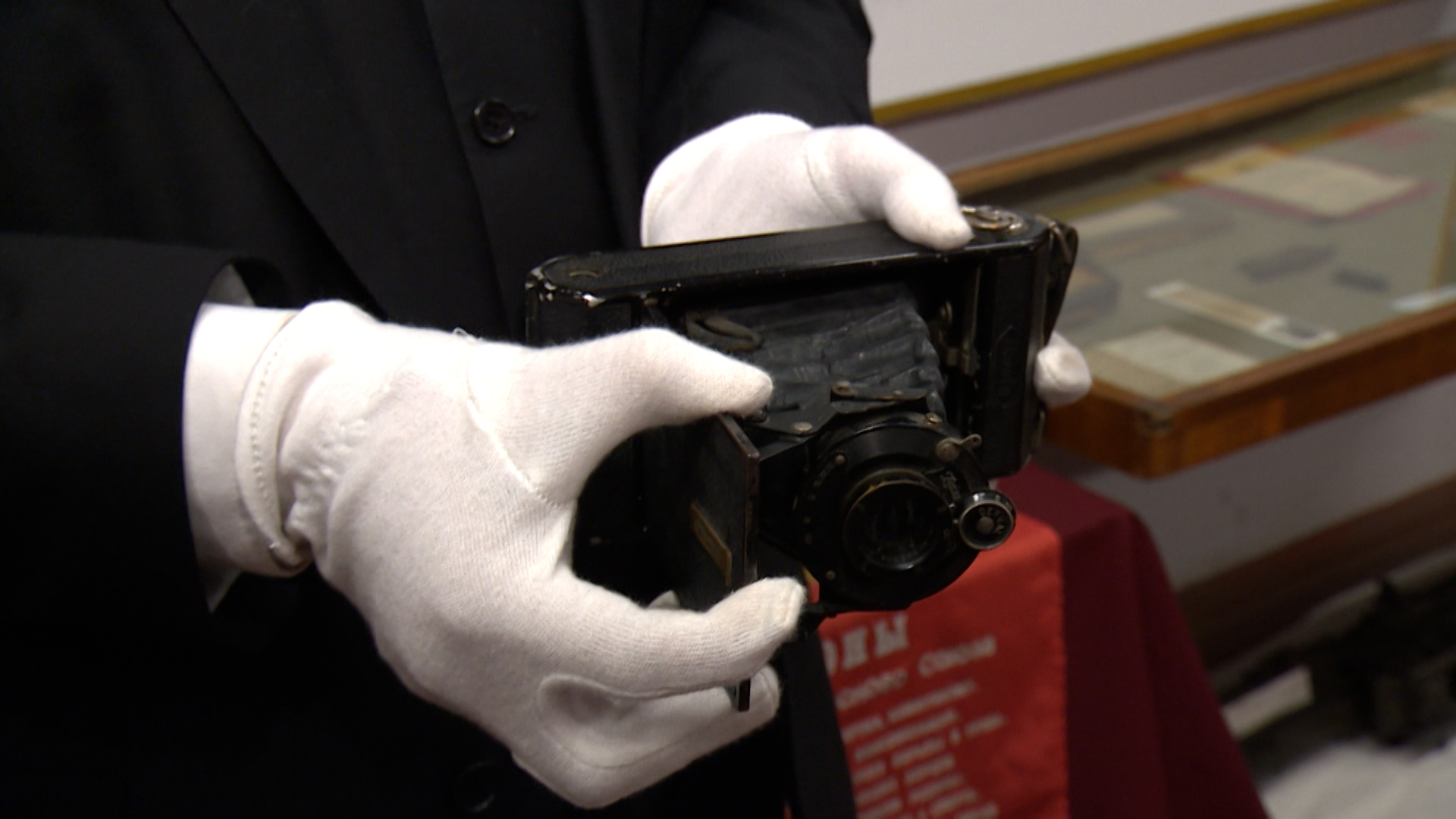 Один из таких приемов – достать экспонат из под стекла. Чем и пользуется восьмиклассник Алексей. В его руках немецкая фотокамера. Она была захвачена у немецких летчиков. И она до сих пор работает.