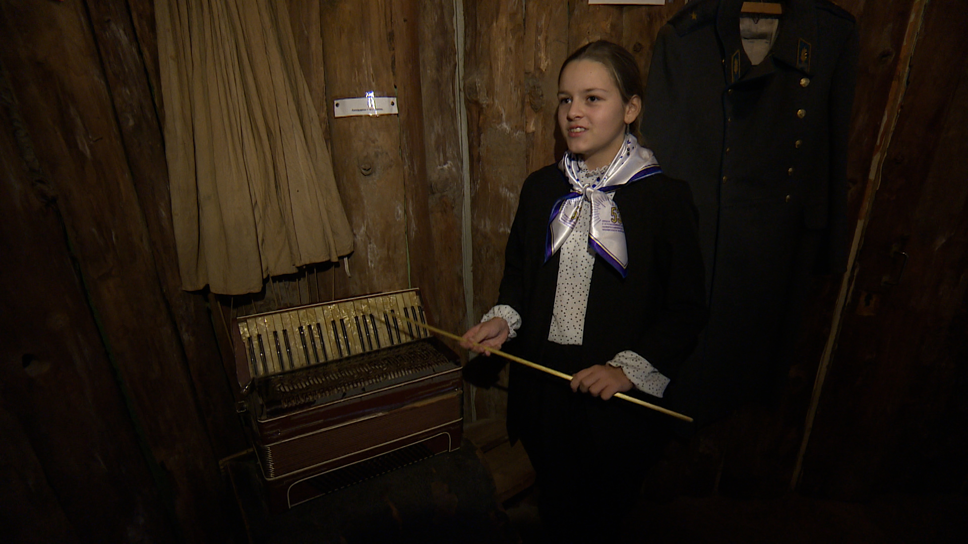 В соседнем помещении навыки гида оттачивает школьница Вероника. Темная комната, стены обшиты деревом — так выглядели блиндажи в годы войны. Юный экскурсовод рассказывает, чем занимались летчики, вернувшись с очередного вылета.