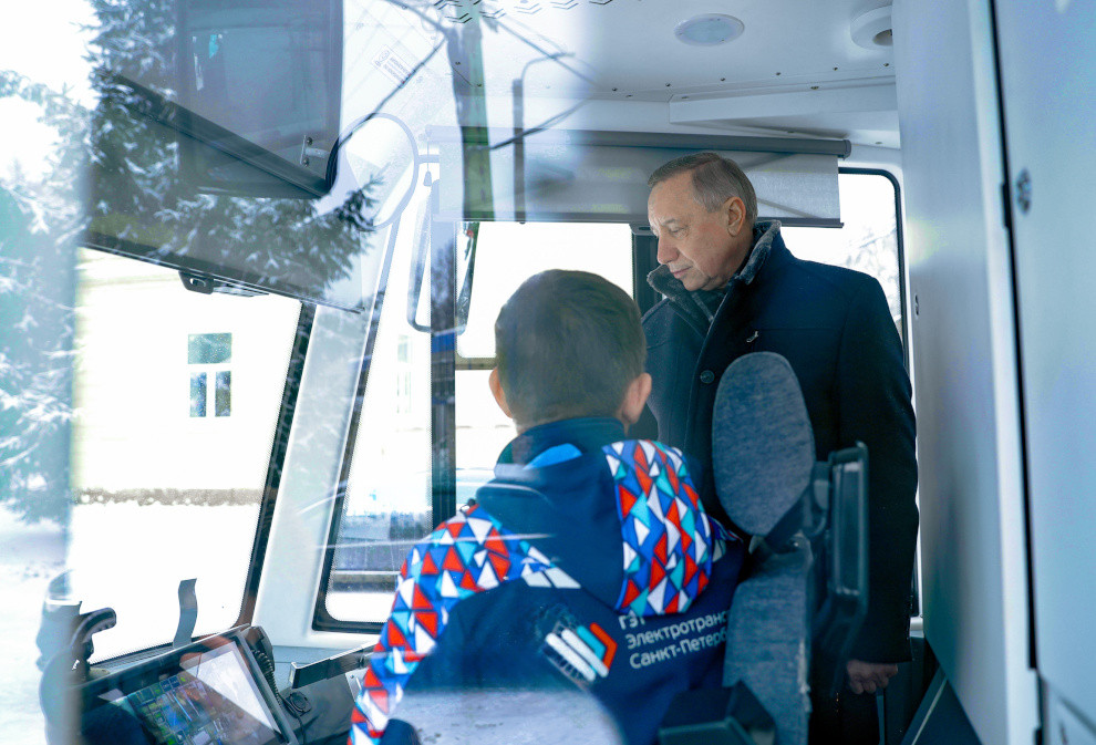 Среди новинок, которые осмотрел губернатор, были двухкабинный трёхсекционнй трамвай «Невский», трамваи Усть-Катавского вагоностроительного завода, трамвай «Довлатов», автобус VOLGABUS «Пулково экспресс».