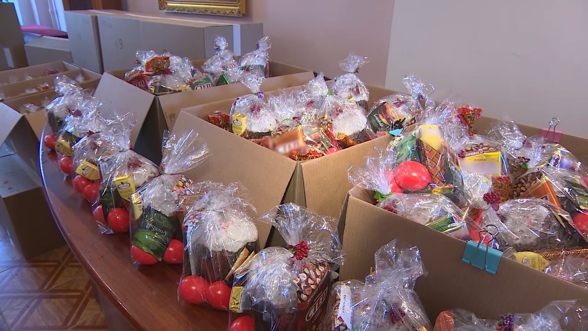 В пакетах – кулич по монастырскому рецепту, пасхальные яйца, шоколад и иконка с молитвой о здравии.