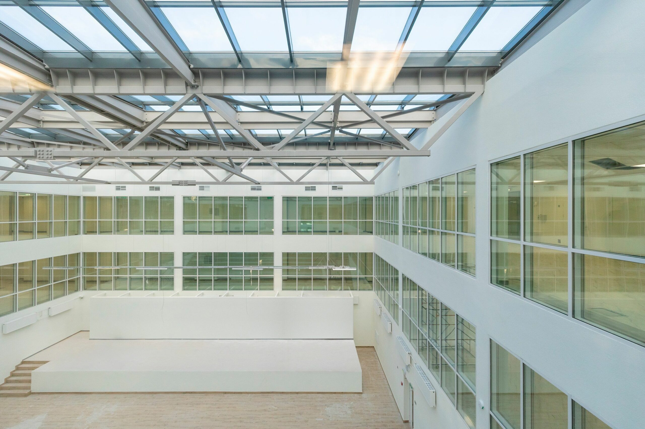 Центром лицея стал актовый зал-трансформер со стеклянным потолком и витражным остеклением. Отсутствие «классической» крыши делает его схожим с атриумом. Вместо постоянных стен в зале будут складные раздвижные перегородки, которые смогут разделить помещения для занятий или создать единое пространство для всех учащихся. Такой универсальный зал впервые создан в школе Петербурга.