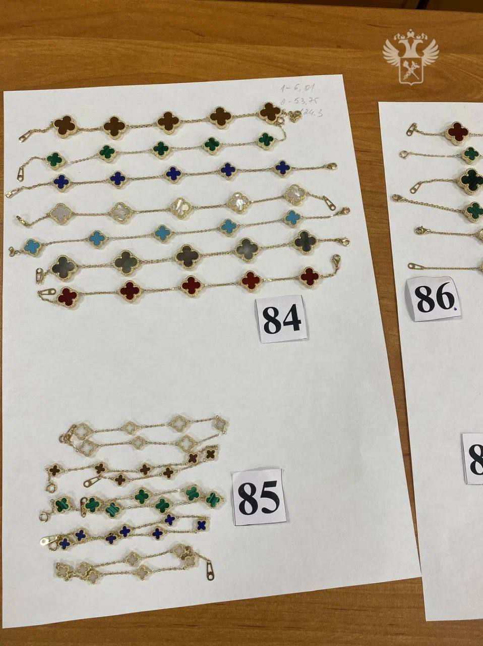 «Экспертиза показала, что изделия изготовлены из золота 750, 585 и 500 проб, со вставками из бриллиантов, фианитов, оникса, перламутра, малахита, культивированного жемчуга, аметиста, цитрина и других материалов, как природных, так и искусственных», – сообщили в пресс-службе.