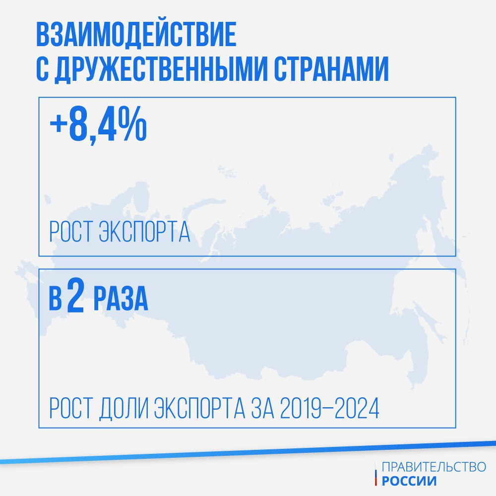 В результате принятых мер российский экспорт в дружественные страны вырос почти на 8,5% по итогам прошлого года, а его доля в общем объеме поставок за рубеж увеличилась более чем в 2 раза за последние 6 лет.