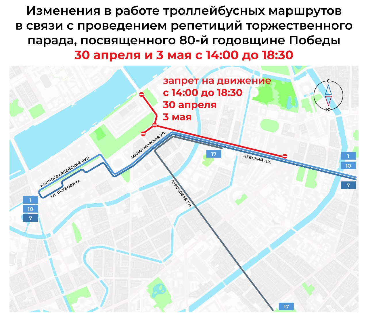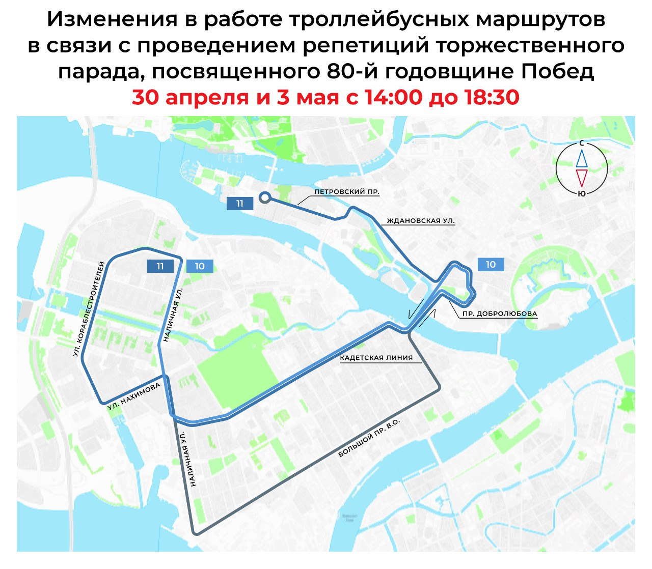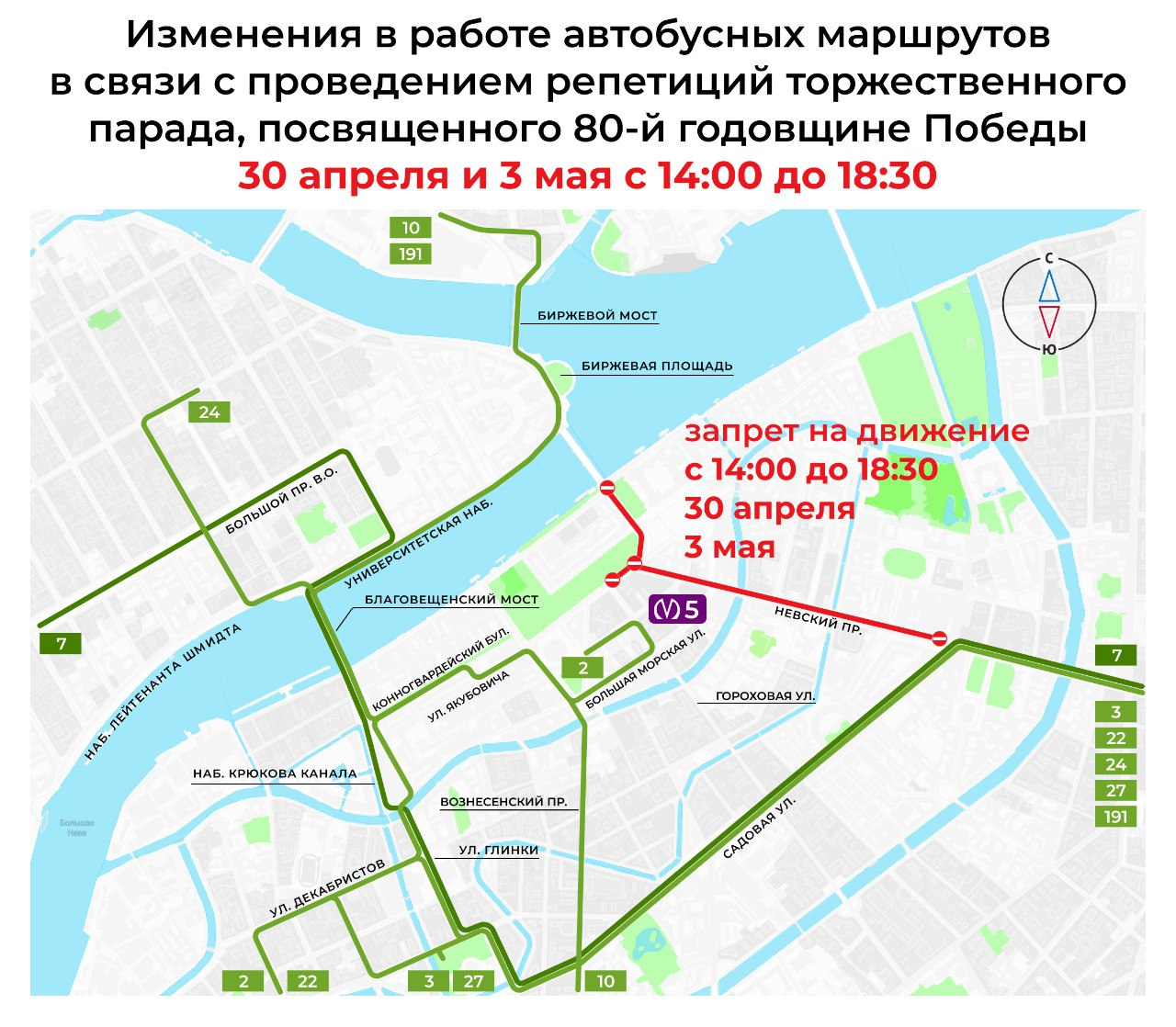 В связи с проведением репетиций торжественного парада, посвященного 80-й годовщине Победы в Великой Отечественной войне, петербургский наземный общественный транспорт временно изменит маршруты.