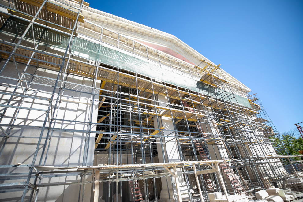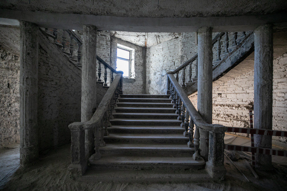На сегодня готовность здания составляет порядка 70%. Ведутся устройство кровли, цоколя фасада, монтаж металлоконструкций, стяжка пола, а также – отделочные работы и прокладка коммуникаций для кабельных линий. Следующий этап – завершение работ по восстановлению несущей способности здания.