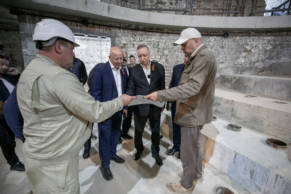 Губернатор Санкт-Петербурга Александр Беглов и временно исполняющий полномочия главы Мариуполя Олег Моргун посетили сегодня восстанавливаемое здание Драматического театра.