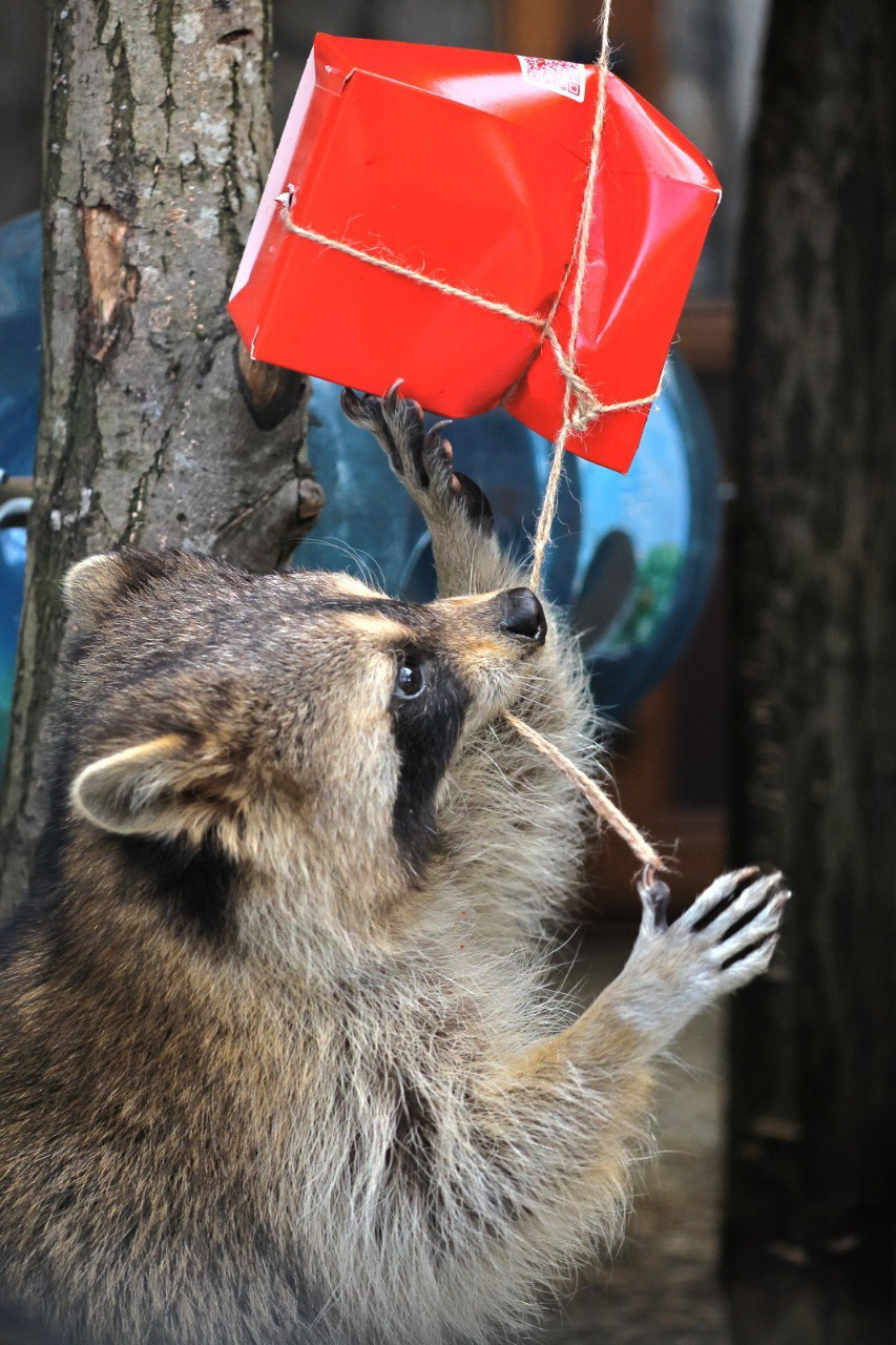 В Ленинградском зоопарке случилась захватывающая схватка енота-полоскуна Фунтика с коварной красной коробкой, внутри которой скрывалось вкуснейшее лакомство — кусочки кролика.
