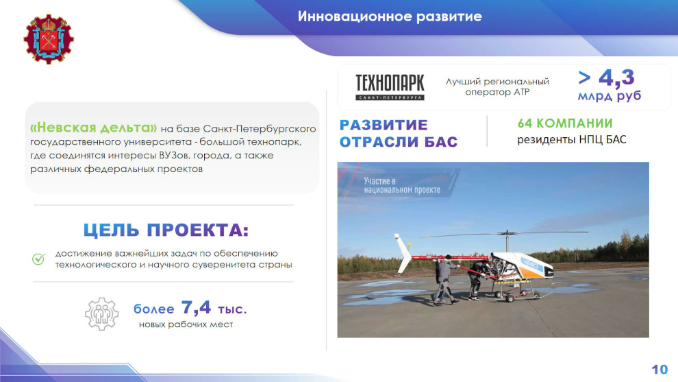 Петербург одним из первых поддержал курс президента на ускоренное развитие беспилотных систем. Город стал опорной площадкой по реализации национального проекта «Беспилотные авиационные системы».