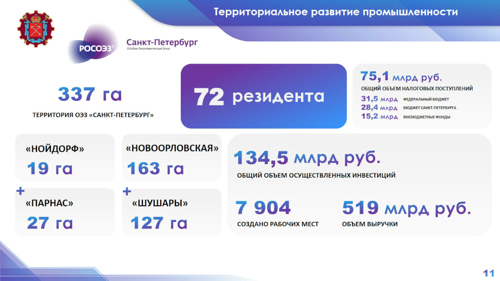 Петербург стал первым регионом в стране, который смог возместить часть затрат из федерального бюджета на строительство инфраструктуры ОЭЗ. В 2024 году бюджет Петербурга получил 2,1 млрд рублей. Общий объем инвестиций резидентов за весь период работы Особой экономической зоны составляет 126,9 млрд рублей.