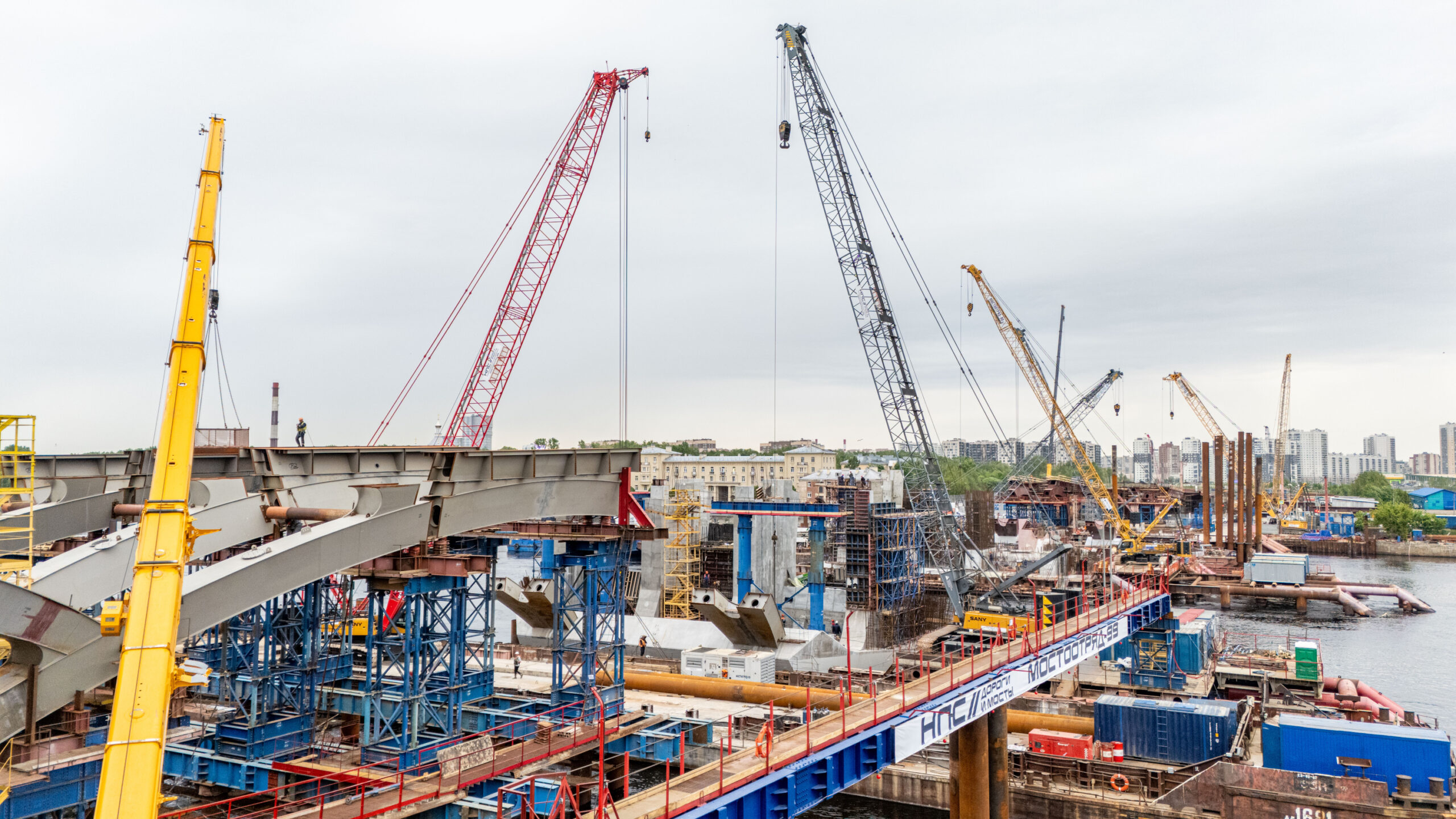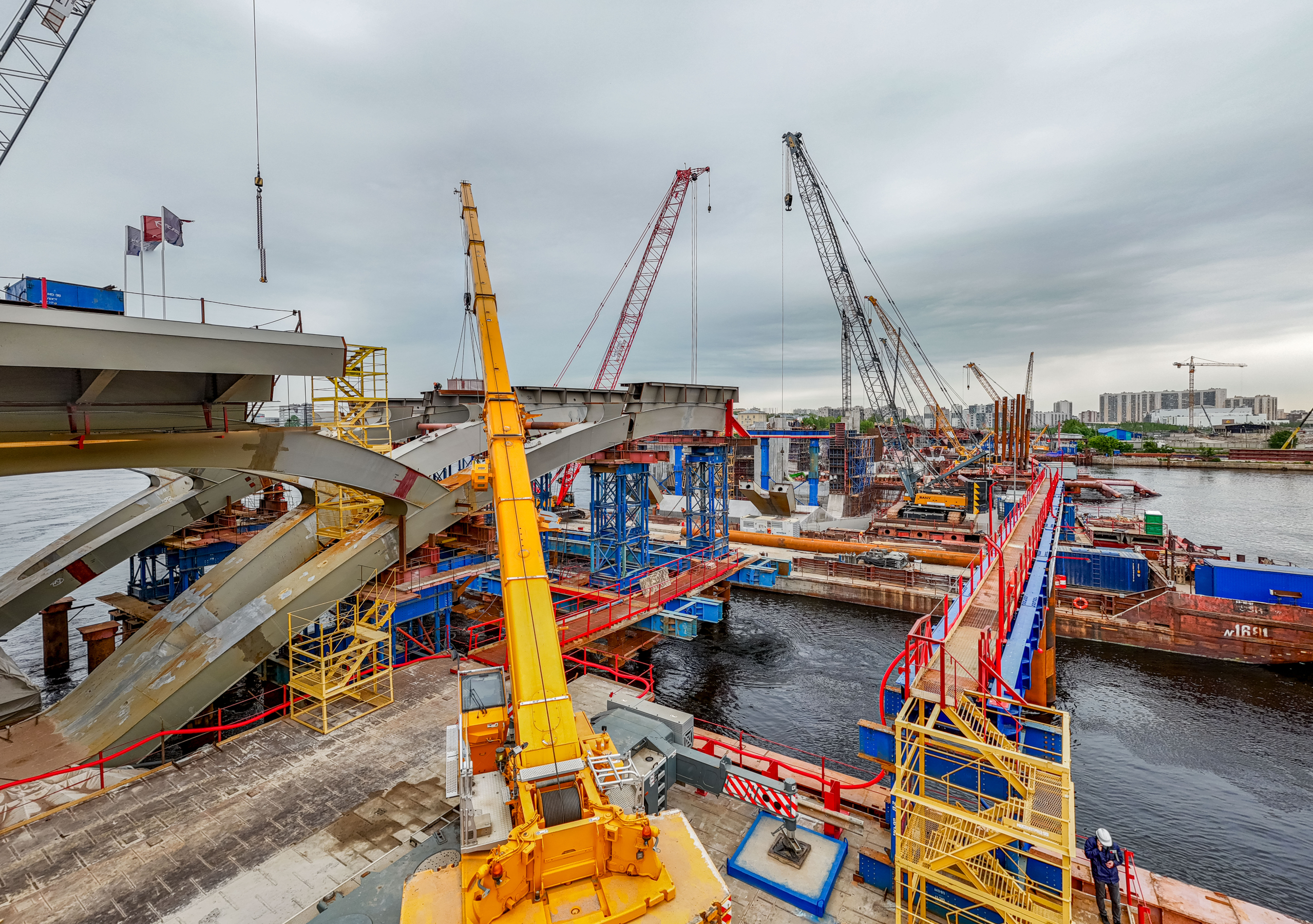 В настоящее время на стапеле Перевозной набережной продолжается сборка металлоконструкции разводного пролетного строения. В четвертом квартале 2025 года разводной пролет новой переправы планируется при помощи барж переместить со стапеля на пятую и шестую опоры и установить в проектное положение.