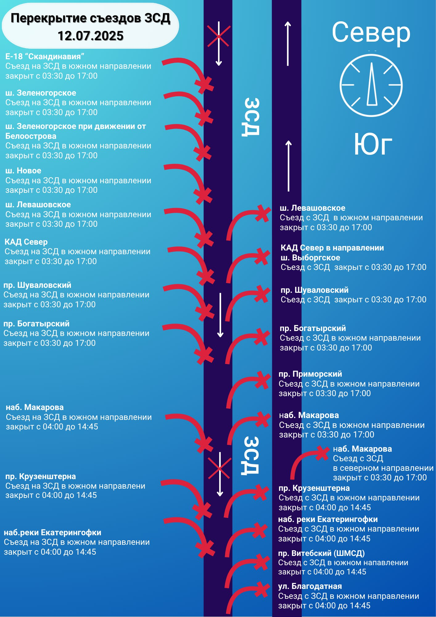 12 июля с 03:30 до 17:00 – движение по ЗСД будет закрыто в направлении Север – Юг (от развязки с трассой «Скандинавия» до съезда на наб. Макарова). Движение Юг – Север останется открытым.