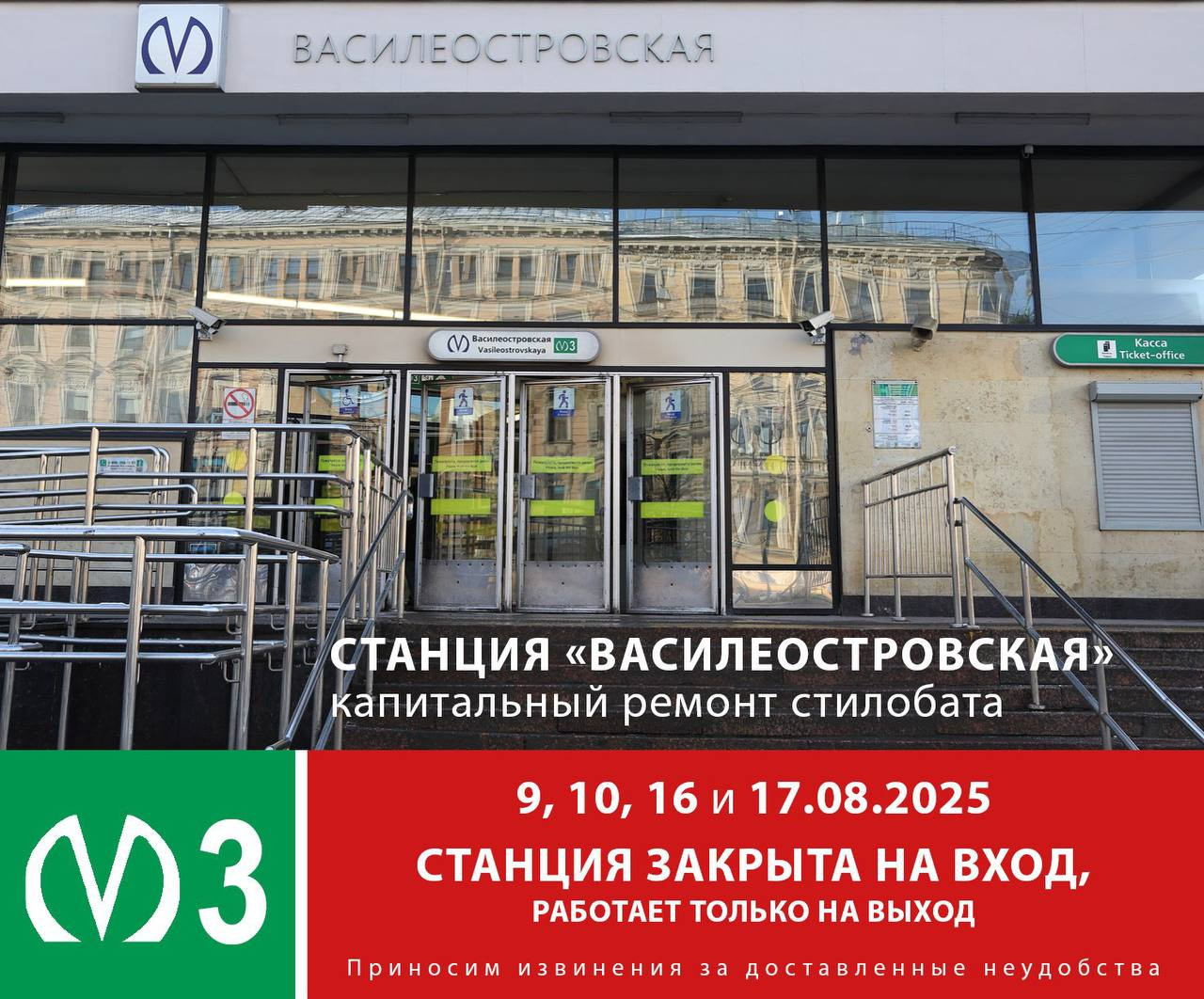 В связи с капитальным ремонтом стилобата на станции метро «Василеостровская» будет временно изменен режим работы вестибюля.