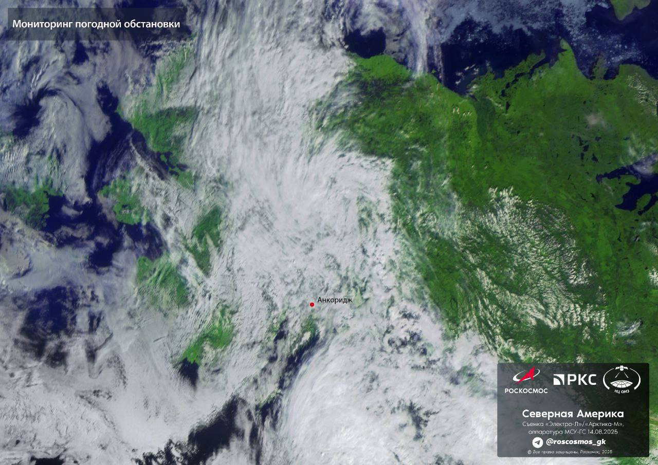 На фото спутника Роскосмоса запечатлен город Анкоридж штата Аляска в США, где состоится предстоящая важная встреча между президентом России Владимиром Путиным и президентом США Дональдом Трампом.