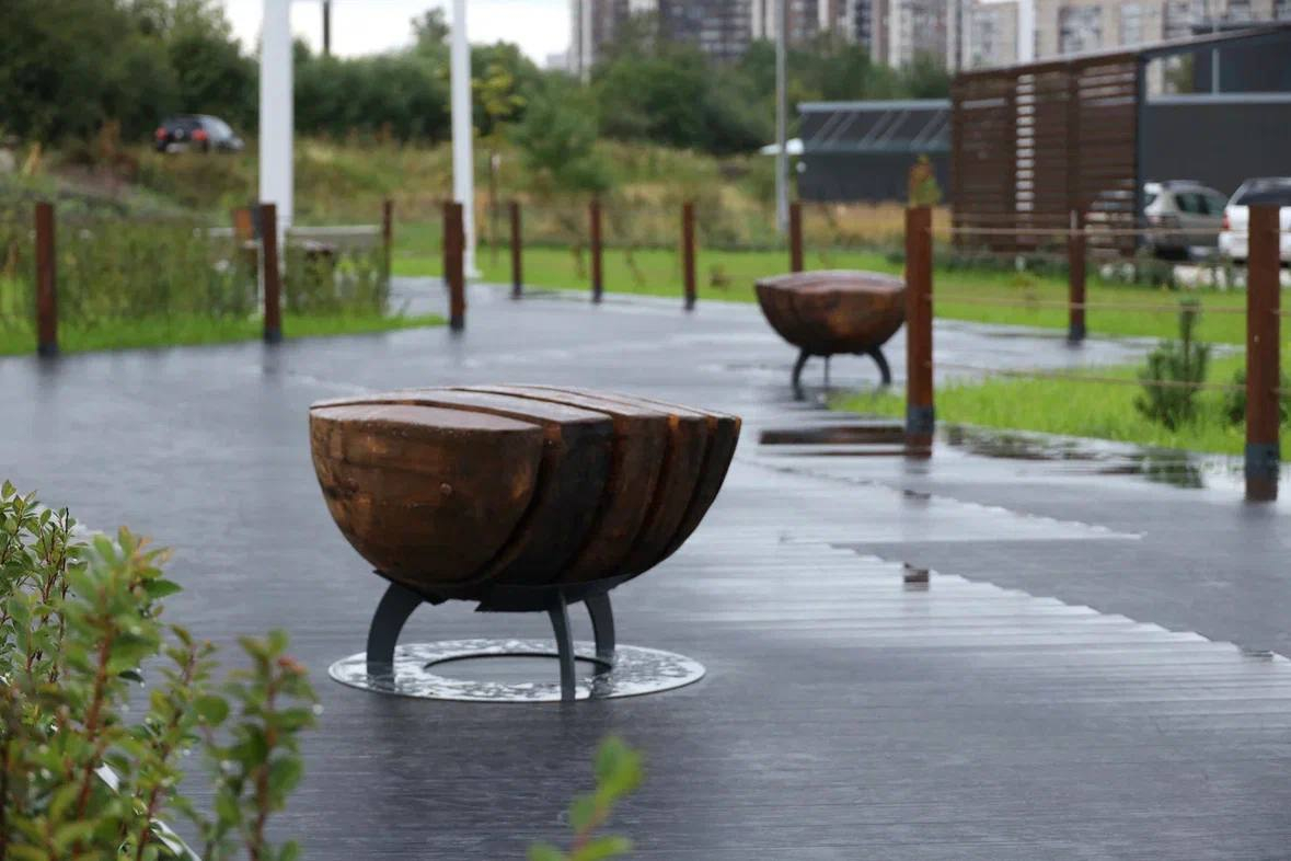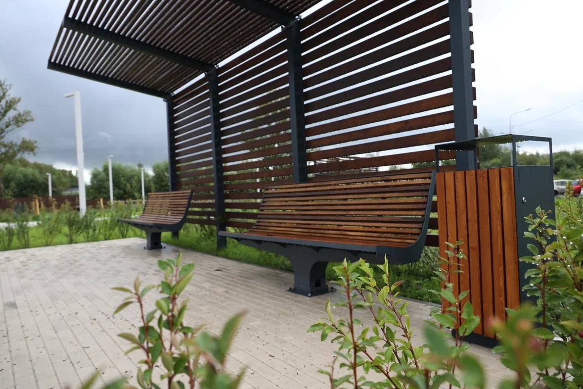 Озеленители высадили 82 дерева и 277 кустарников, обустроили 399 метров живой изгороди, формирующей границы и уютные уголки. Установлена современная уличная мебель, смонтированы необычные радиальные качели. Организовано наружное освещение.