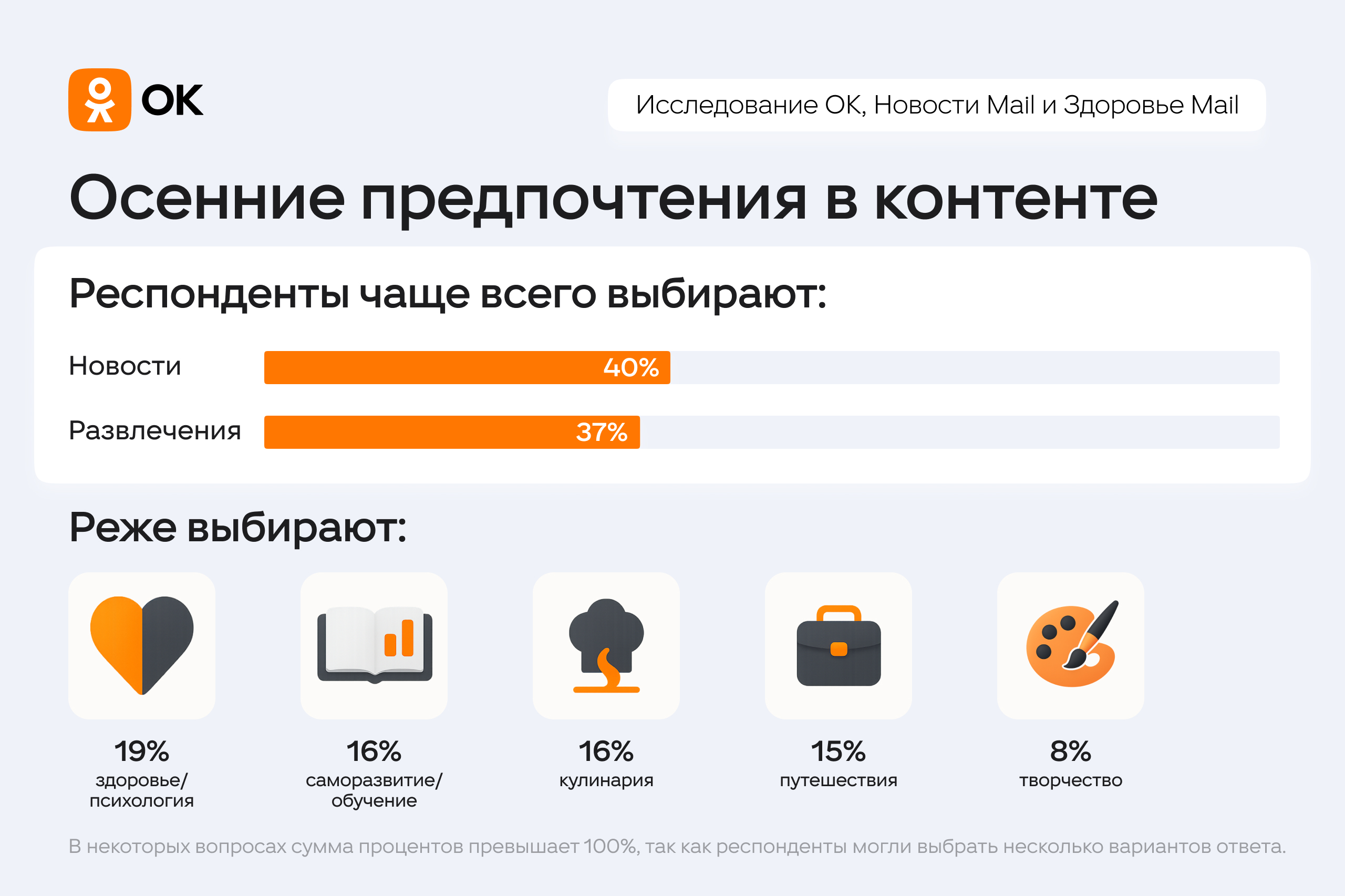Одноклассники, Новости Mail и Здоровье Mail (проекты VK) провели опрос среди российских пользователей, чтобы выяснить, как они относятся к наступлению осени, как готовятся к новому сезону, укрепляют ли иммунитет и какими хобби увлекаются.