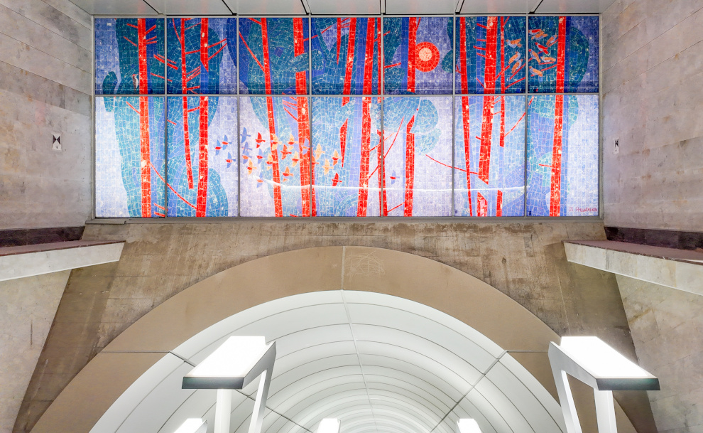 Витраж выполнен в спокойных тонах бордового, синего, серого и голубого. Его сюжет отражает мотивы северной природы в окрестностях Петербурга. Также закончена облицовка полов и стен кассового зала натуральным гранитом. Размещено архитектурное освещение. Завершена установка четырех эскалаторов, ведутся пусконаладочные работы, сообщает пресс-служба Смольного.