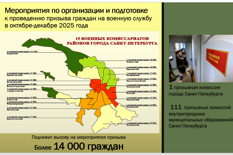 Призывная кампания начнется 1 октября и продлится до 31 декабря. Ее организует военный комиссариат Санкт‑Петербурга. В соответствии с Указом президента содействие оказывают исполнительные органы государственной власти и местного самоуправления. Призывные комиссии созданы в каждом муниципальном образовании под председательством глав местных администраций, сообщает пресс-служба Смольного.
