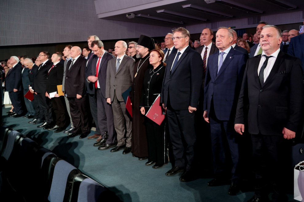Министр здравоохранения РФ Михаил Мурашко, губернатор Александр Беглов и заместитель полномочного представителя президента РФ в СЗФО Роман Балашов приняли участие в торжественном вечере в БКЗ «Октябрьский», посвященном 100-летию основания Санкт‑Петербургского государственного педиатрического медицинского университета и 120-летию университетской клиники.