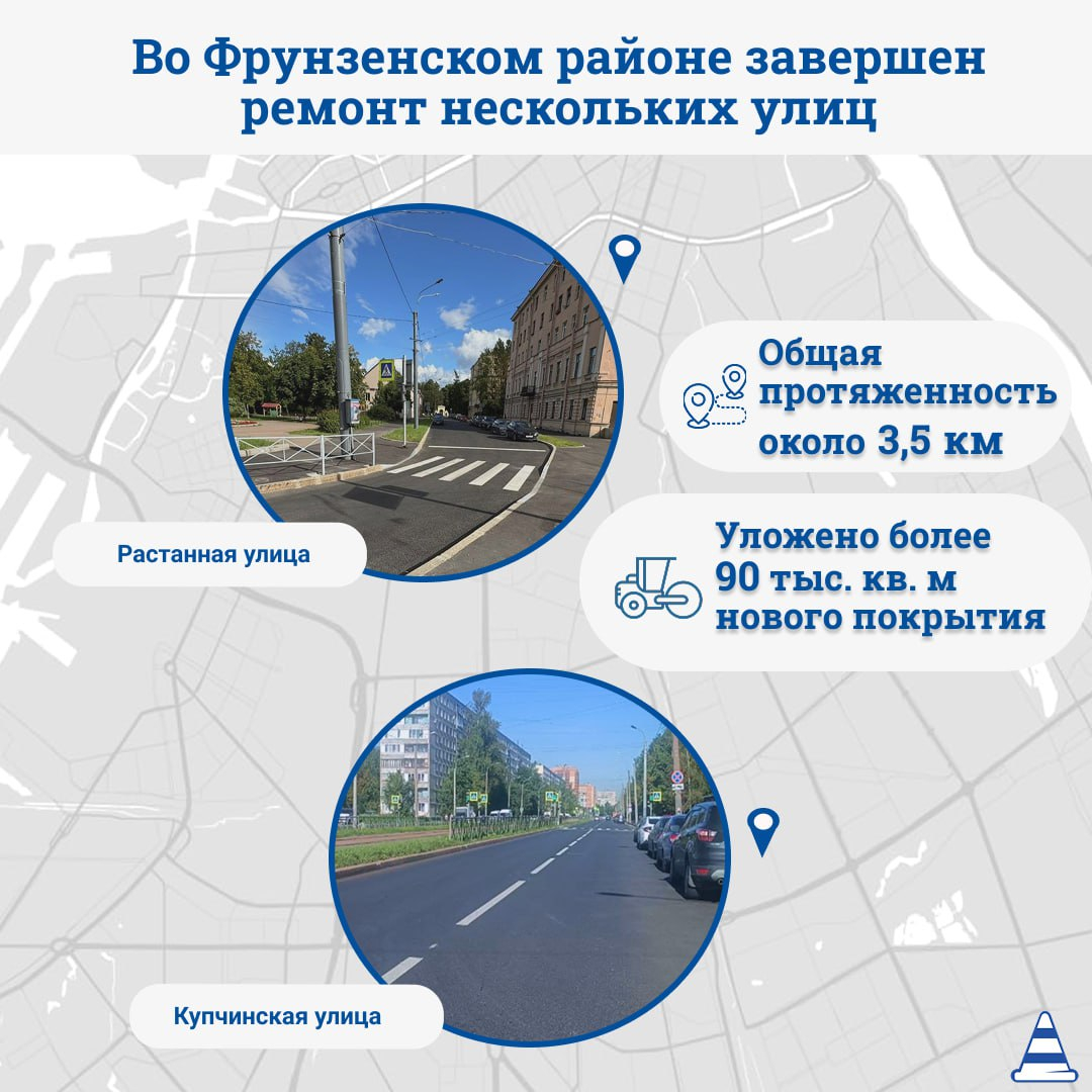 Благодаря национальному проекту «Инфраструктура для жизни» удалось отремонтировать Расстанную улицу, где уложили более 20 тысяч квадратных метров нового асфальта. Также завершили обновление Купчинской улицы. Дорожники уложили около 70 тысяч «квадратов» нового покрытия.