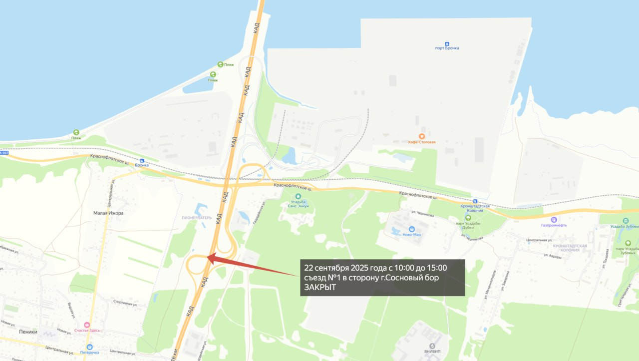 Так, с 10:00 до 15:00 будет закрыт съезд №1 с КАД в сторону города Сосновый Бор на путепроводе транспортной развязки Бронка.