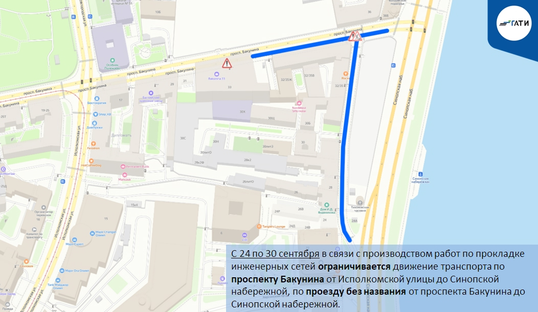 С 24 по 30 сентября в связи с производством работ по прокладке инженерных сетей ограничивается движение транспорта по проспекту Бакунина от Исполкомской улицы до Синопской набережной, по проезду без названия от проспекта Бакунина до Синопской набережной.