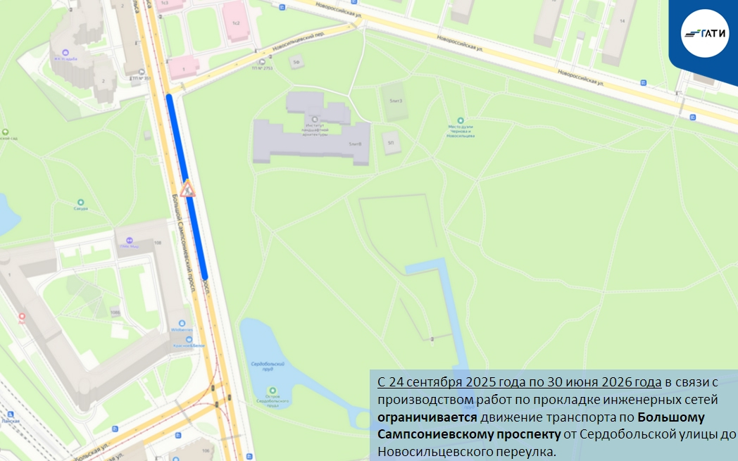 С 24 сентября 2025 года по 30 июня 2026 года в связи с производством работ по прокладке инженерных сетей ограничивается движение транспорта по Большому Сампсониевскому проспекту от Сердобольской улицы до Новосильцевского переулка.