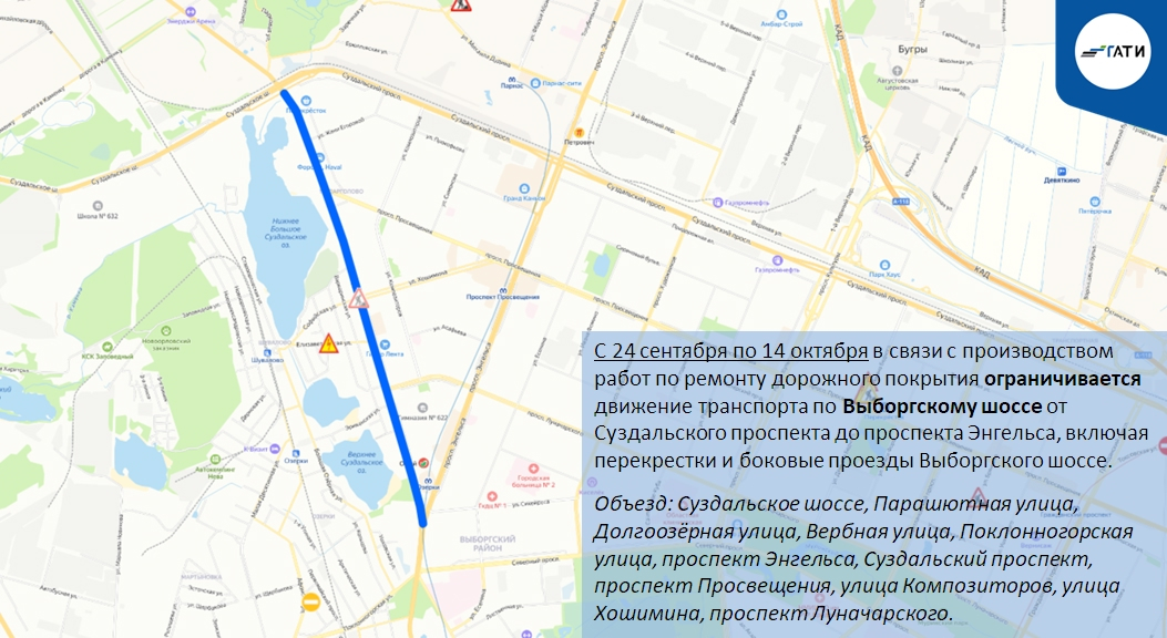 С 24 сентября по 14 октября в связи с производством работ по ремонту дорожного покрытия ограничивается движение транспорта по Выборгскому шоссе от Суздальского проспекта до проспекта Энгельса, включая перекрестки и боковые проезды Выборгского шоссе.