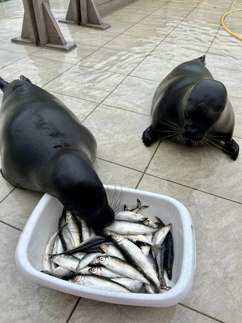 Оба самца отлично охотятся на воле. Они ловят дикую рыбу, которую сотрудники фонда выпускают в вольер. В рационе нерп — плотва, окуньки и ряпушка.
