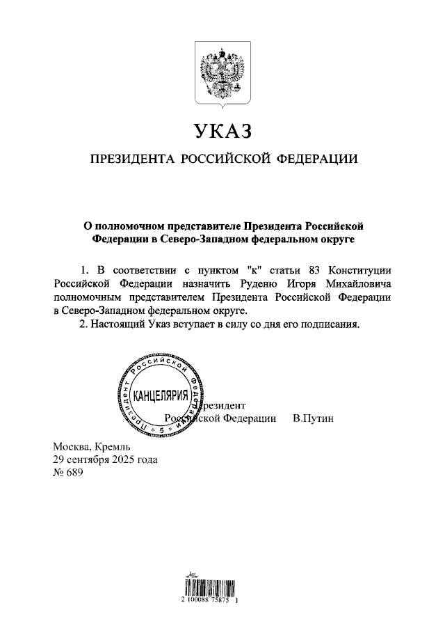 «В соответствии с пунктом «к» статьи 83 Конституции Российской Федерации назначить Руденю Игоря Михайловича полномочным представителем Президента Российской Федерации в Северо-Западном федеральном округе», — говорится в тексте документа.