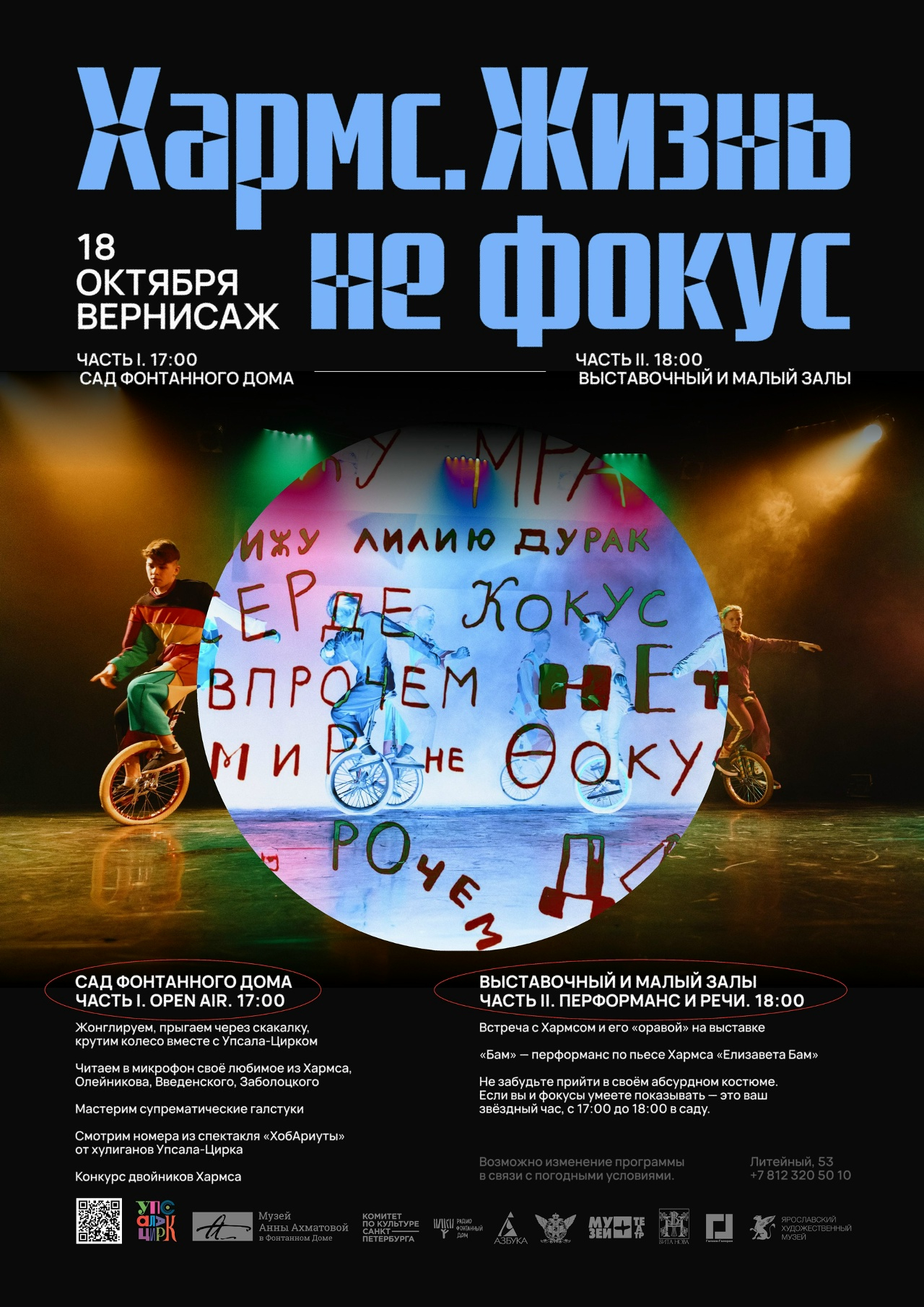 В Фонтанном Дом Анны Ахматовой откроется выставка «Хармс. Жизнь не фокус». Вернисаж пройдет в формате «творческого хулиганства» и охватит сад Фонтанного Дома, выставочный и театральный залы музея. Гостей ждут номера из спектакля «Хобариуты» от Упсала цирка, перформанс по пьесе Хармса «Елизавета Бам», встреча с Хармсом и его «оравой» и многое другое.