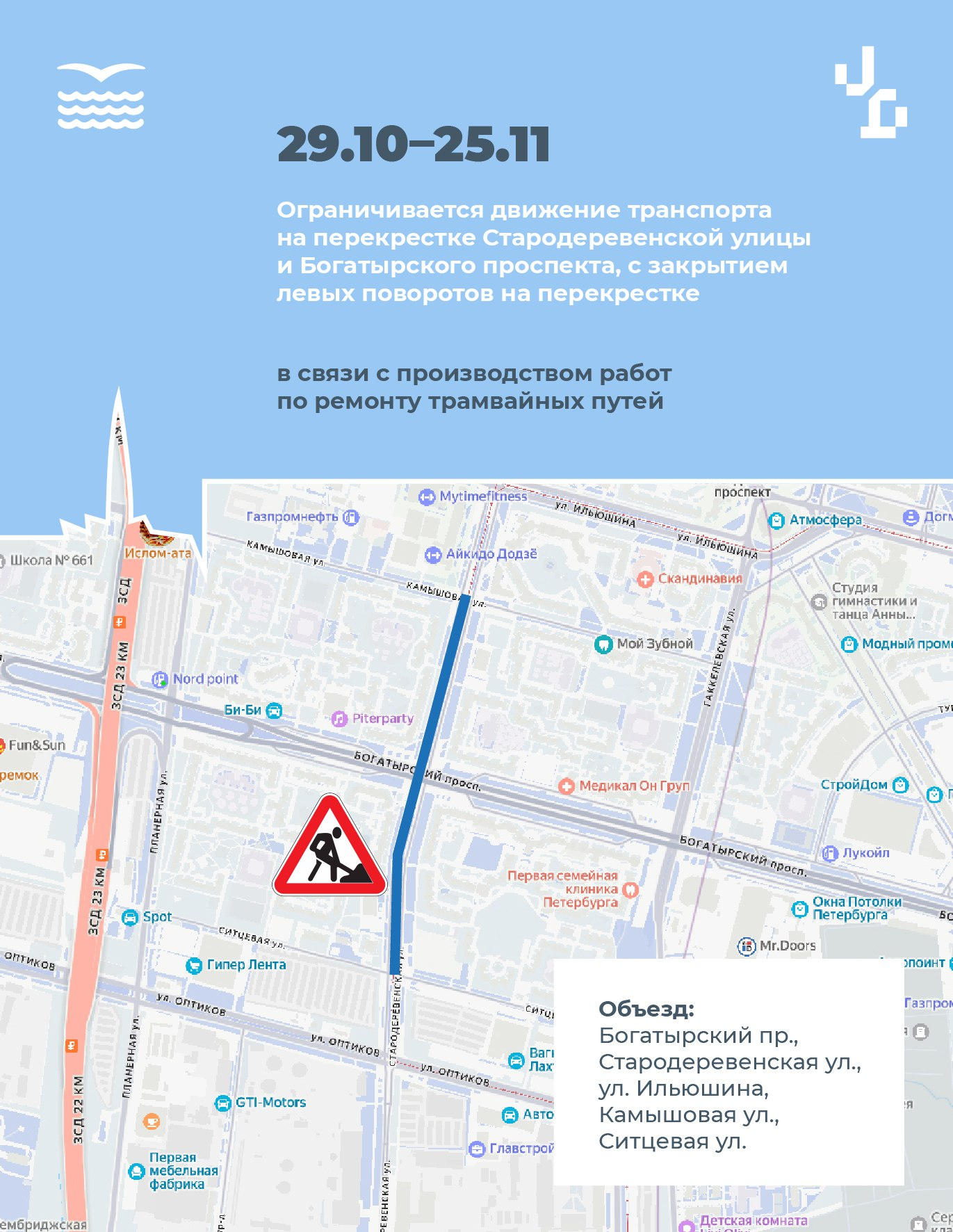 Для объезда закрытого участка рекомендуется использовать следующий маршрут: Богатырский проспект, Стародеревенская улица, улица Ильюшина, Камышовая улица, Ситцевая улица.