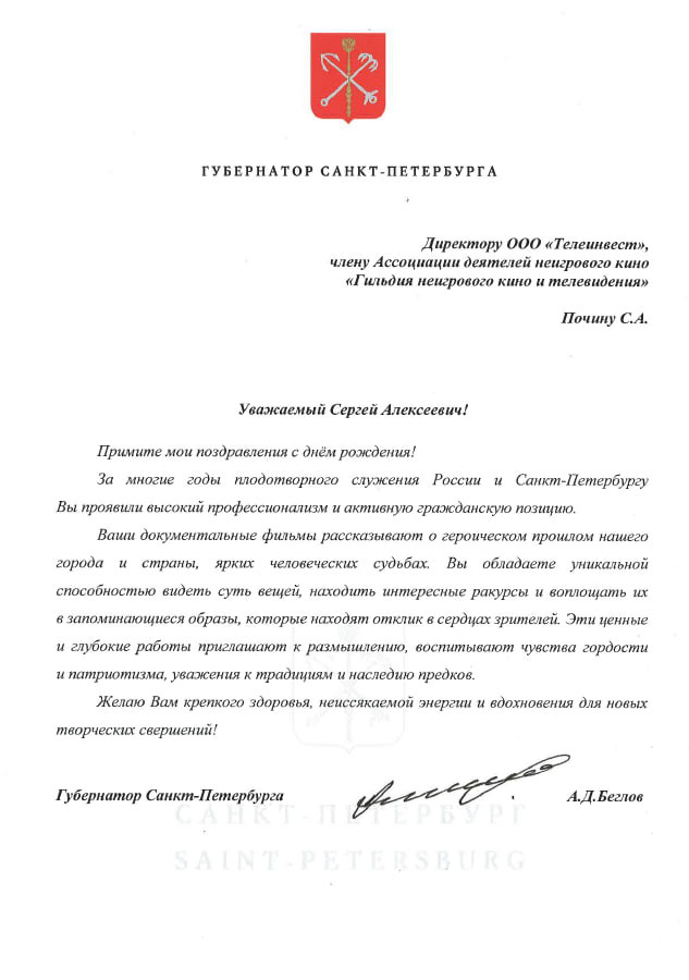 «За многие годы плодотворного служения России и Санкт-Петербургу Вы проявили высокий профессионализм и активную гражданскую позицию. Ваши документальные фильмы рассказывают о героическом прошлом нашего города и страны, ярких человеческих судьбах. Вы обладаете уникальной способностью видеть суть вещей, находить интересные ракурсы и воплощать их в запоминающиеся образы, которые находят отклик в сердцах зрителей. Эти ценные и глубокие работы приглашают к размышлению, воспитывают чувства гордости и патриотизма, уважения к традициям и наследию предков», — говорится в поздравлении главы Северной столицы.