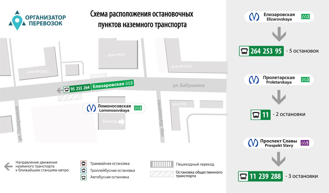 До станции «Елизаровская» можно доехать на автобусах №№ 264, 2532 и 95.