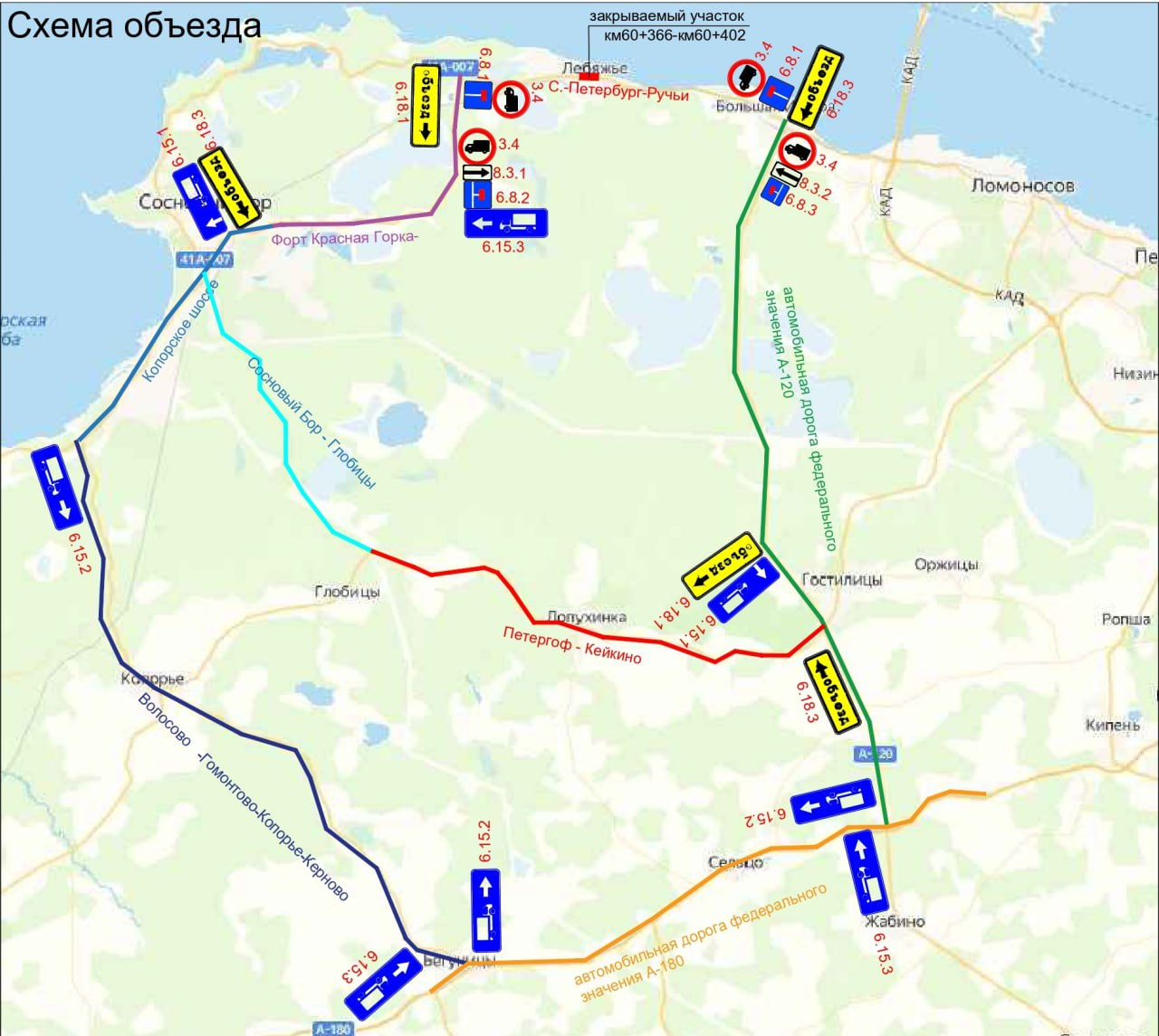 Движение транспорта перекрыто с 17:00. Объезд возможен по трассе А-120, по дорогам Петергоф — Кейкино, Сосновый Бор — Глобицы, Форт Красная Горка — Коваши — Сосновый Бор.