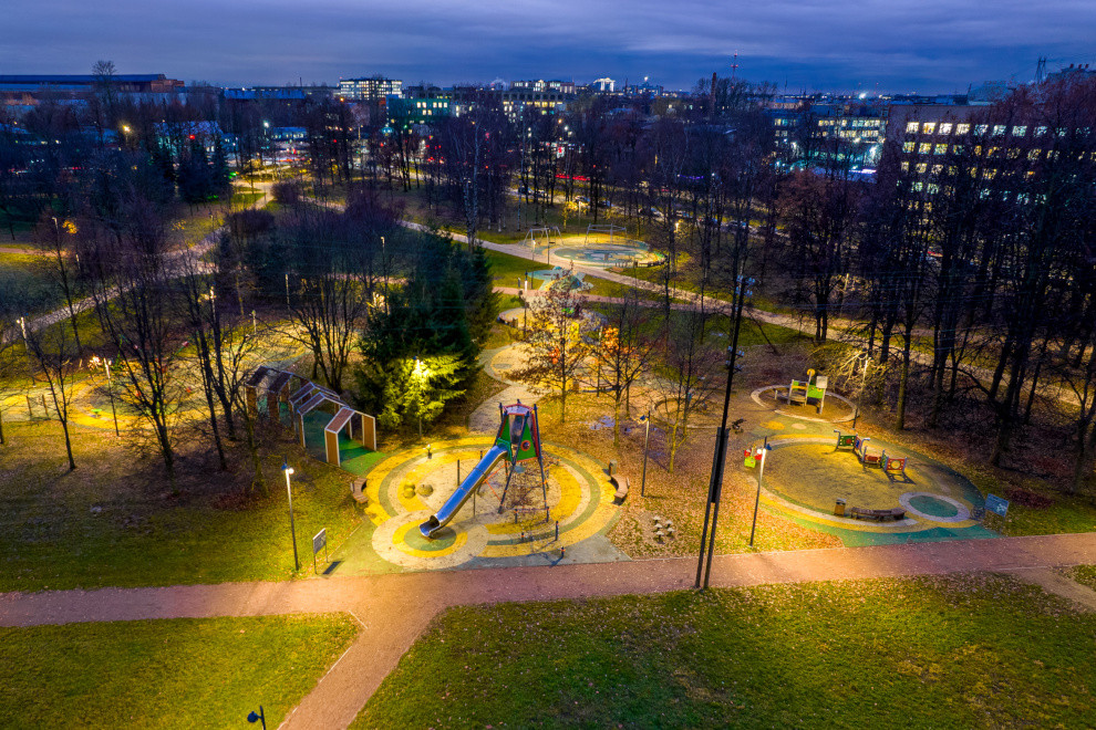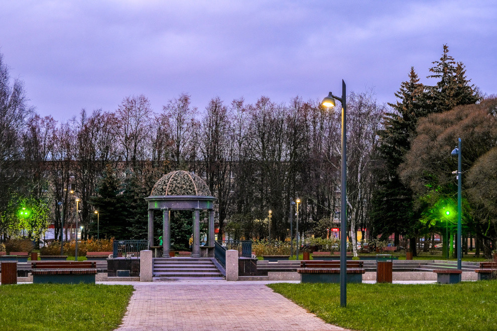 Новые фонари разместили на металлических опорах, расположенных равномерно по периметру всего парка. Кабельные линии проложили под землей. Изюминкой стала живописная зеленая подсветка деревьев. Прожекторы с таким акцентом установлены вокруг фонтана. Новое освещение получили спортивные и детские площадки, зоны спокойного отдыха. Общественное пространство стало комфортнее и безопаснее для прогулок по вечерам.