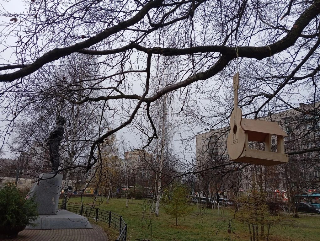 В сквере Виктора Цоя скворечники и кормушки выполнили в виде музыкальных инструментов.