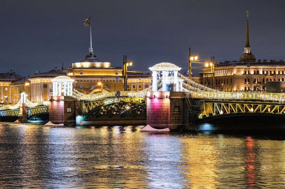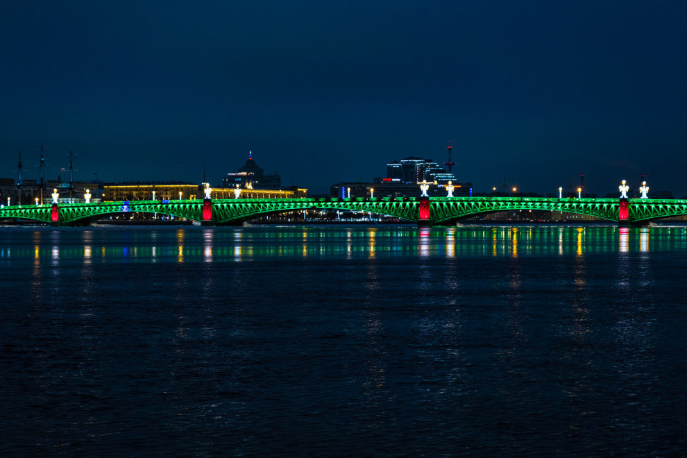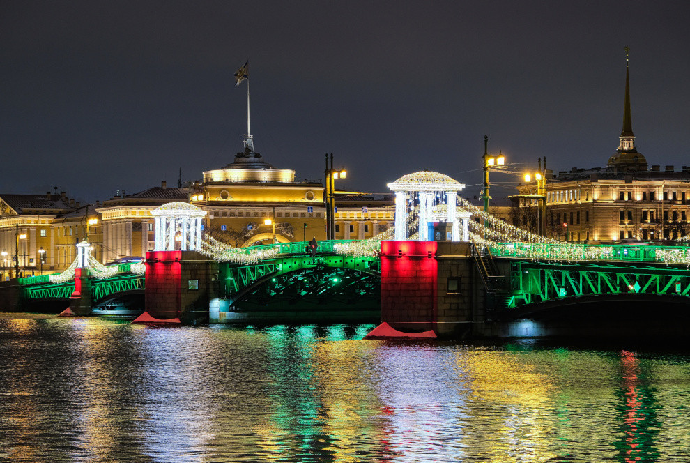 В канун Нового года главные символы Петербурга — Дворцовый и Троицкий мосты — заиграют праздничной подсветкой. Их пролёты окрасятся в насыщенный изумрудный цвет, а опоры станут ярко-красными. Об этом сообщили в пресс-службе Смольного.