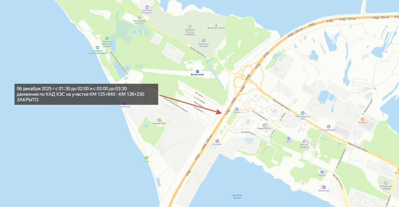 Движение на участке КАД у Кронштадтского шоссе перекроют в ночь на 6 декабря. Об этом сообщили в пресс-службе Дирекции КЗС.