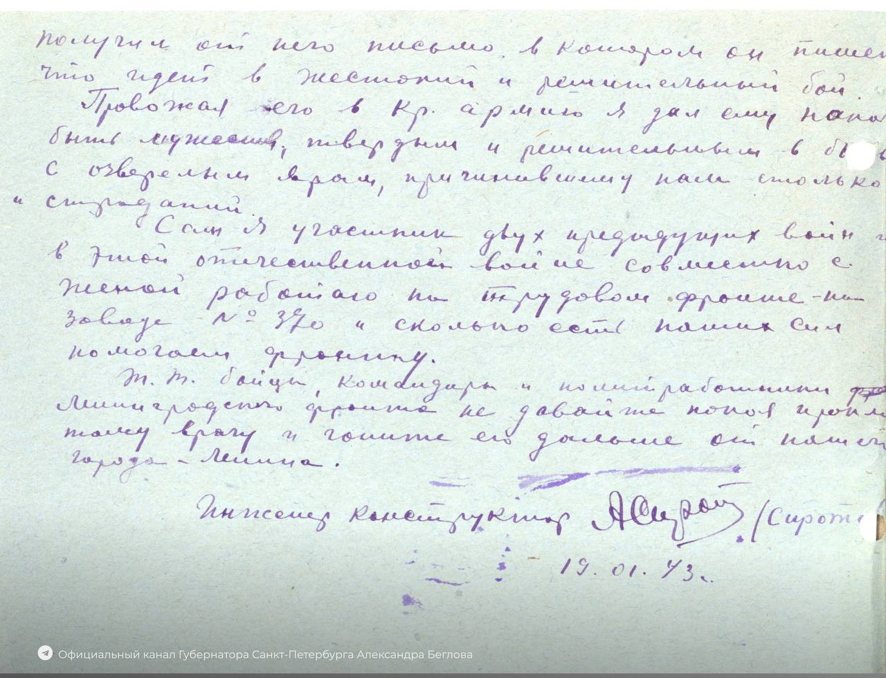 Инженер-конструктор завода А. Сирота: «Вами разорваны жесткие вражеские цепи, сковывающие нас, ленинградцев, в течение 16 месяцев. За это тяжелое время многое пережито, но дух не сломлен даже мукой голода и невиданной в истории продолжительной блокадой… Товарищи бойцы, командиры, политработники Ленинградского фронта, не давайте покоя проклятому врагу и гоните его дальше от нашего города Ленина».