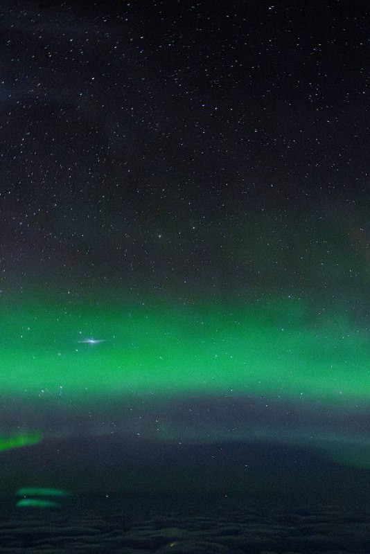 Пресс-служба Госкорпорации «Роскосмос» поделилась снимками с борта самолета, на которых изображены геминиды и северное сияние.