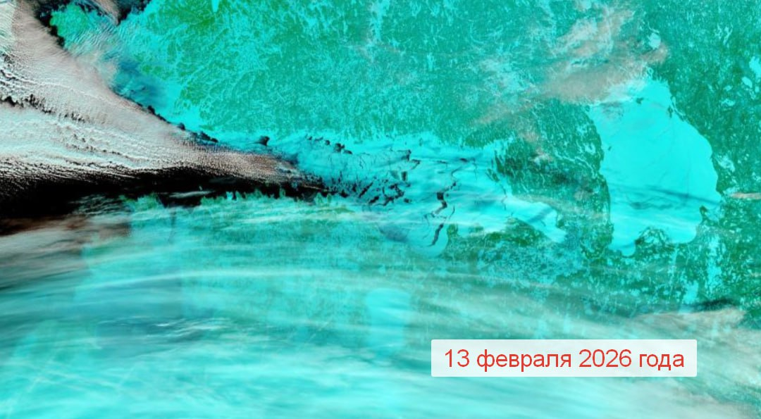 Однако сильный северо-восточный ветер, связанный с прохождением циклона южнее региона, начинает разрывать и растягивать ледовое покрытие — это отчетливо заметно на спутниковых данных.
