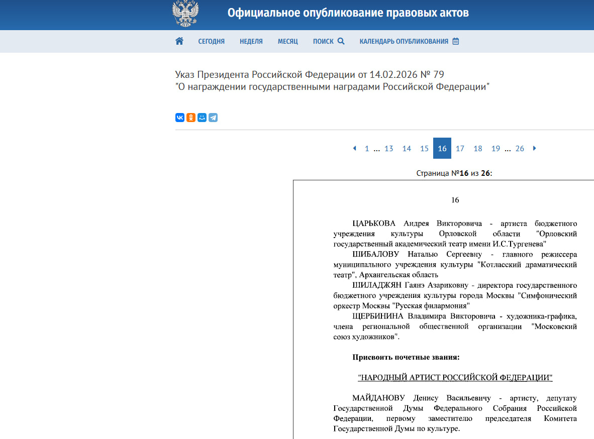 Документ был опубликован сегодня на официальном портале правовой информации. Как отмечается в указе, «звание присвоено артисту, депутату Государственной Думы РФ, первому заместителю председателя комитета по культуре Денису Васильевичу Майданову».