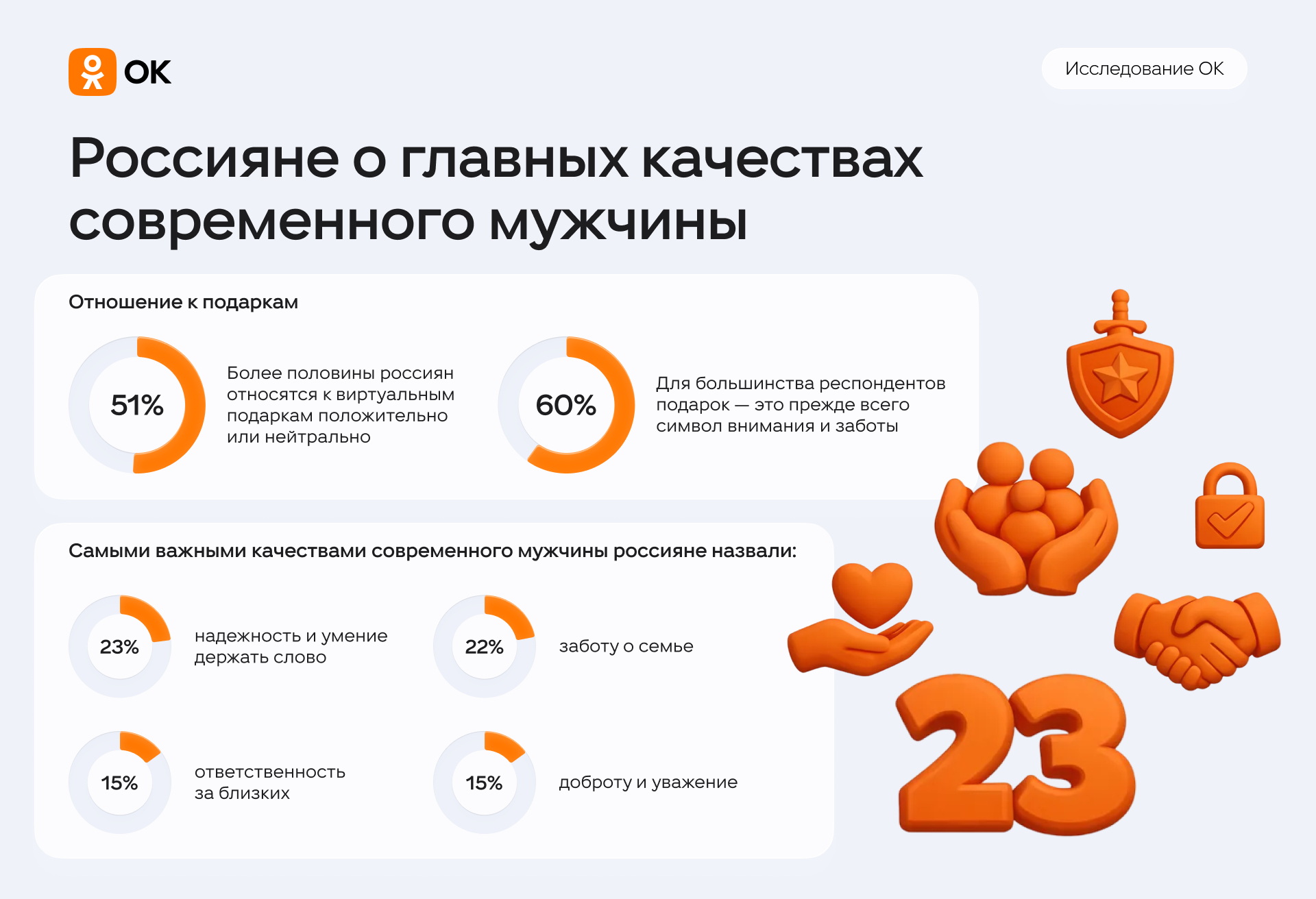 Социальная сеть Одноклассники провела исследование среди своих пользователей и выяснила, какие качества современного мужчины они считают наиболее важными, какие ценности ставят на первое место и как относятся к подаркам на мужские праздники.