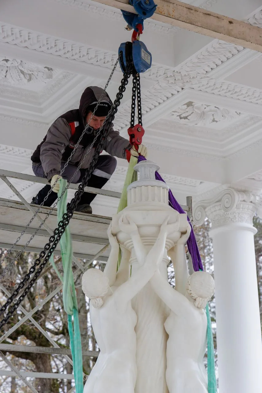 Реставрационный процесс, длившийся в 2024–2025 годах, был комплексным. Мастера восстановили лепнину и штукатурку, укрепили стропильную систему и заменили кровлю, смонтировали вентиляцию. Для стабилизации конструкций было установлено свайное поле, проведена гидроизоляция и отреставрирована каменная облицовка. Теперь отреставрированная скульптура «Трех граций» вновь встречает посетителей своей первозданной красотой.